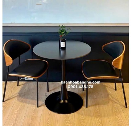 Bộ sản phẩm gồm bàn tròn mặt sơn tĩnh điện màu đen nhám kết hợp với ghế ngồi bọc nệm êm ái, khung sắt chắc chắn. Điểm nhấn nổi bật là phần lưng ghế được ốp gỗ cong tự nhiên, vừa tăng tính thẩm mỹ vừa mang lại cảm giác thoải mái khi ngồi.